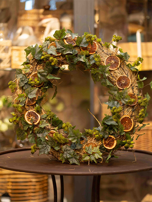 Corona de paja armada con rodajas de naranjas